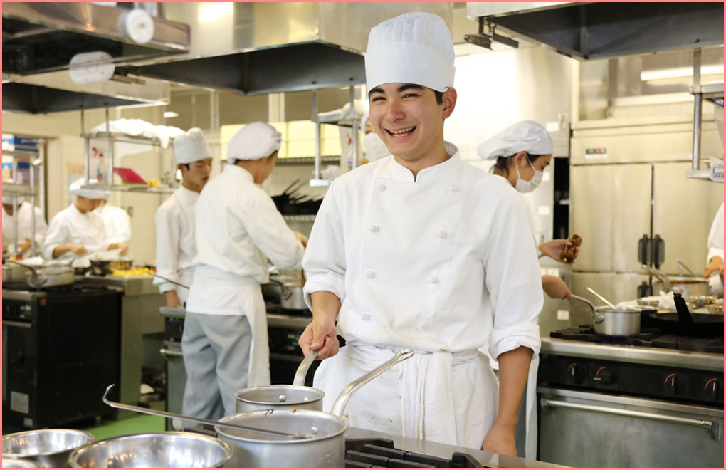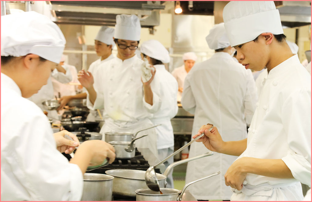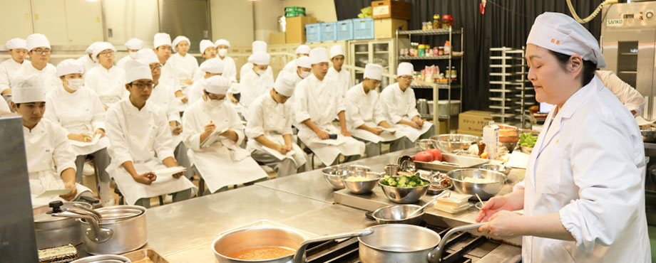 本校は厚生労働大臣指定の調理師養成施設であり、卒業時に国家試験免除で調理師免許が取得できます。調理師や栄養士・管理栄養士の資格を持った教員が実習などの技術的な授業、栄養価算出など理論的な授業を行います。