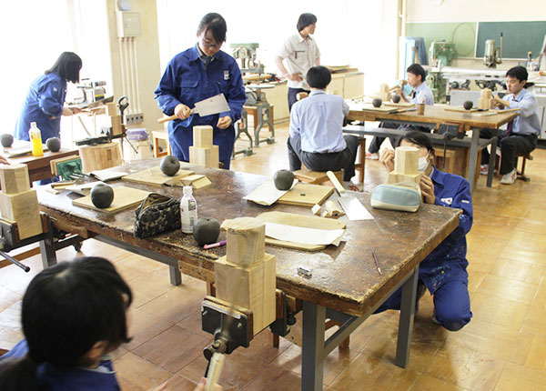 美術工芸科の専門科目は全て少人数制で行われます。生徒一人ひとりの多様な表現や個性に対応するのはもちろん、実習機械や道具を取り扱う際の安全のためです。20名から8名ほどのグループに担当の教員がそれぞれついて丁寧な指導をすることで、生徒と先生の距離が近くなり、個々の生徒に合った表現技術をしっかり身に付けさせ、それぞれの創造性を伸ばすことにつながっています。